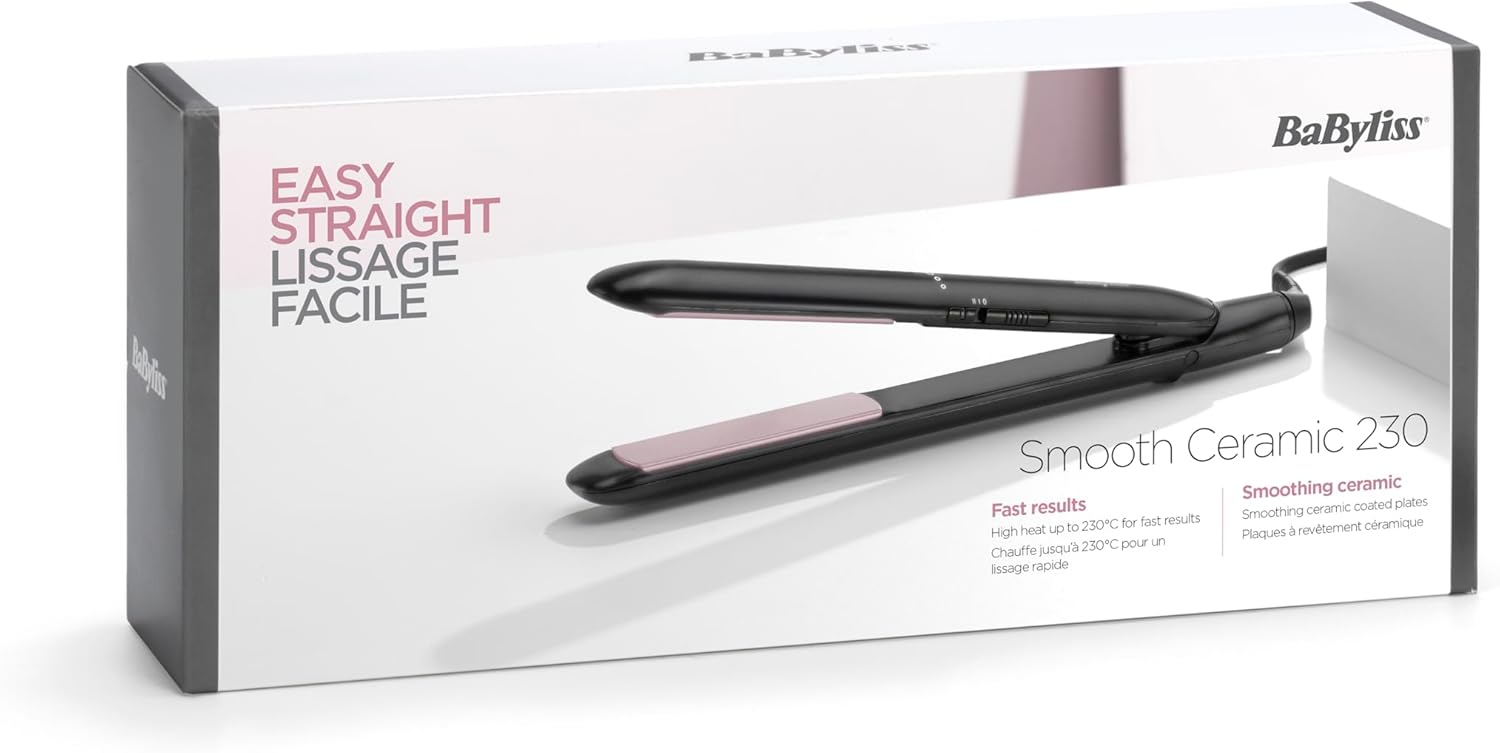 BaByliss hair straightener with satin touch ceramic coated plates heats up to 230c with fast heat up two heat settings 200c and 230c led indicator auto shut off multi voltage support and 18m swivel cord made in china