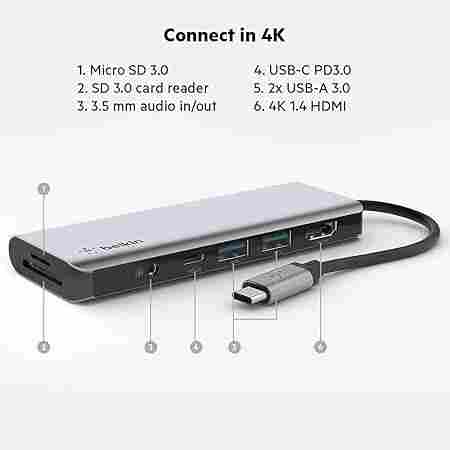 Belkin USB-C Multiport Adapter 7-in-1 (BL-USBC-7P-MM-ADP / AVC009btSGY). Features HDMI 4K, 2x USB-A 3.1, USB-C 100W PD, SD/Micro SD slots, and 3.5mm audio. Compatible with Mac and Windows laptops.