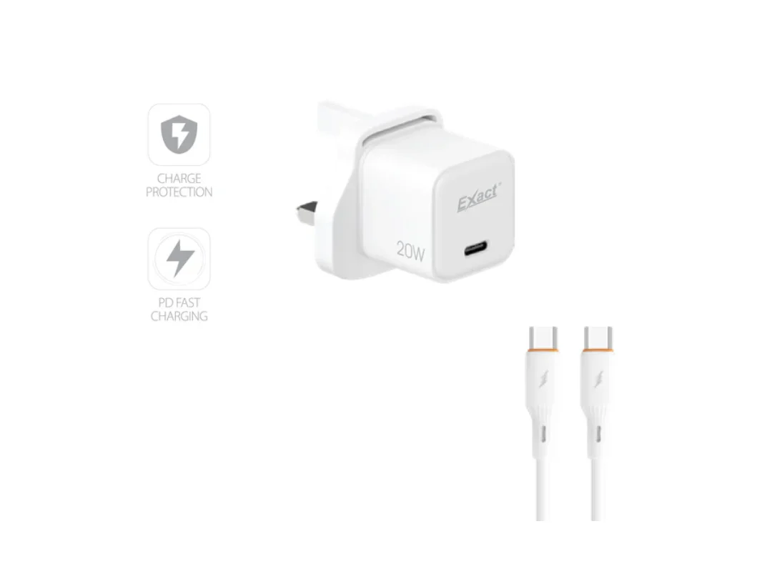 Exact PD Adapter EX1211 White delivers fast and efficient 20W charging using advanced GaN technology. Designed for everyday use, it supports PD fast charging via USB-C and comes with a USB-C to USB-C cable for reliable and safe power delivery.