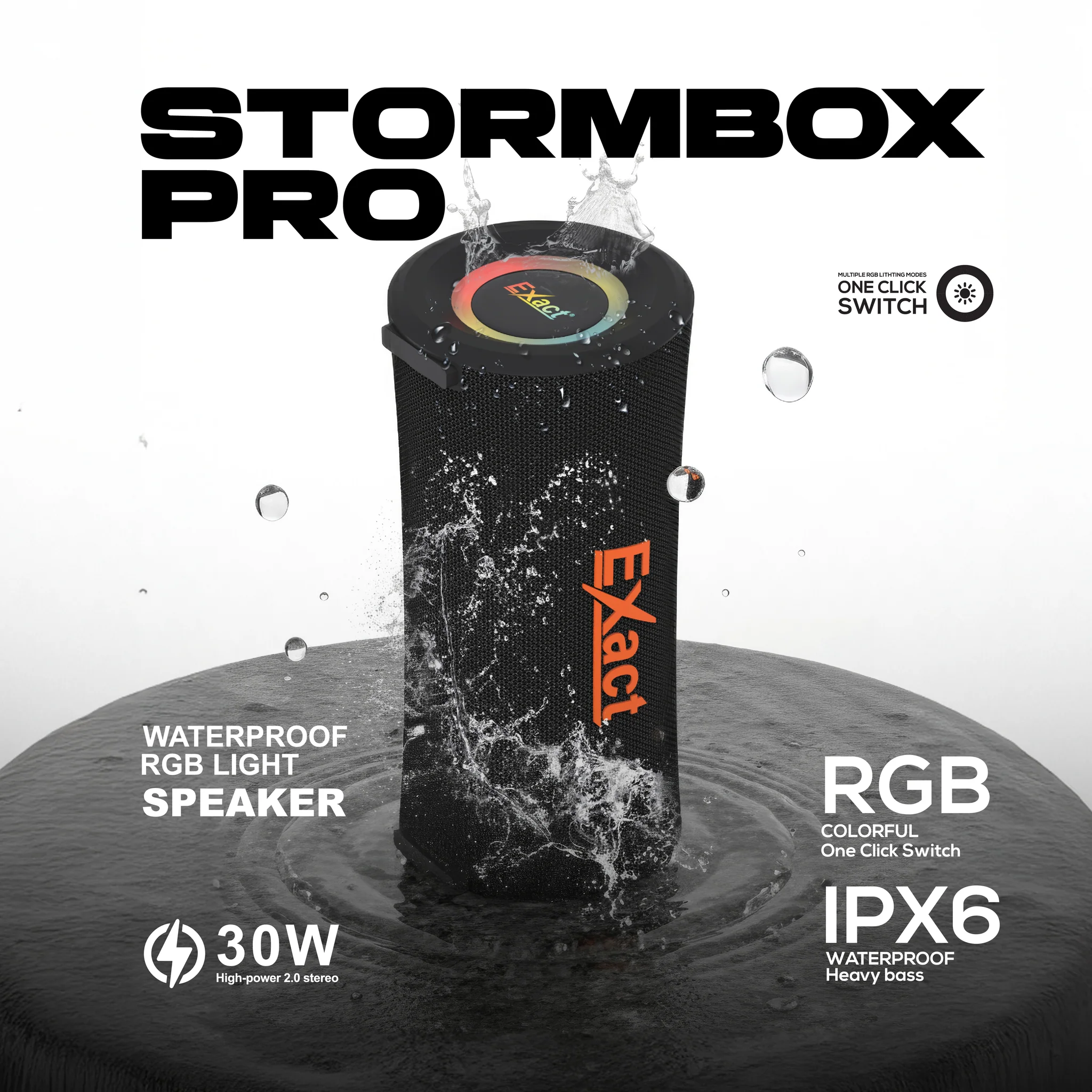 Exact Stormbox Pro Waterproof Bluetooth Speaker 30W EX1226 delivers powerful 30 watt audio output with deep bass and clear sound in a rugged waterproof design. Built for indoor and outdoor use it offers stable Bluetooth connectivity and strong performance making it ideal for parties travel and everyday listening.