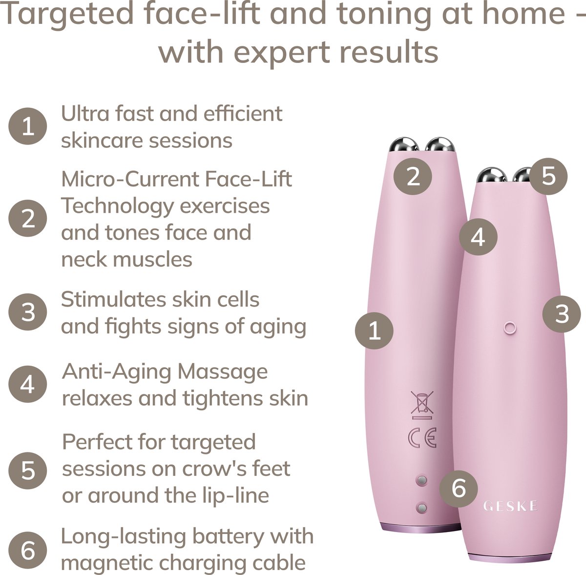 GESKE MicroCurrent Face Lift Pen 6 in 1 in Pink delivers precise facial lifting and toning using advanced microcurrent technology. It helps reduce fine lines improve skin firmness and enhance facial contours for targeted skincare results at home.