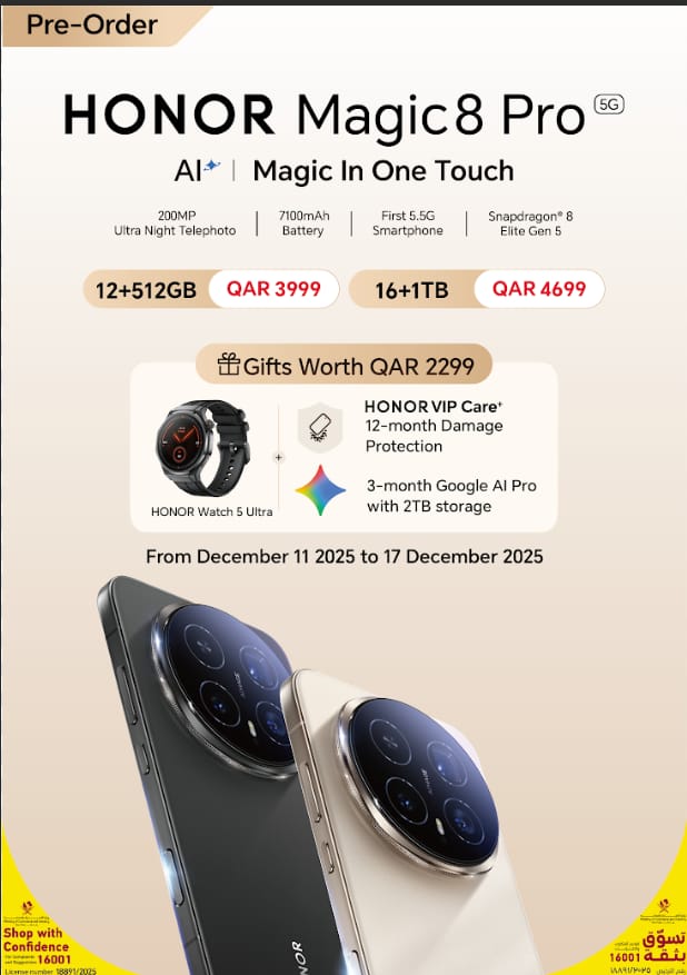 Buy Honor Magic 8 Pro 5G with 12GB RAM and 512GB storage in Black color. Powered by a flagship Snapdragon processor, featuring an immersive OLED display, advanced triple camera system, long-lasting battery and fast wired and wireless charging. Available in Qatar with local warranty.