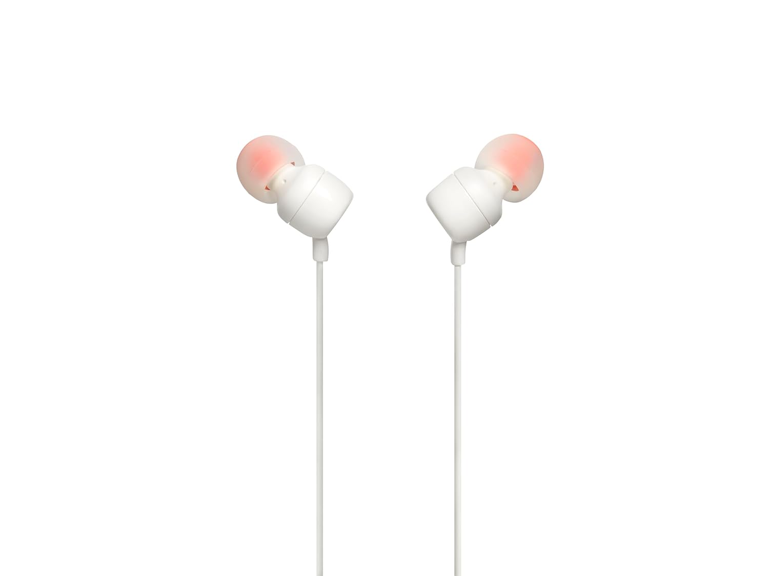 JBL T110 White wired in ear headphones deliver powerful JBL Pure Bass sound lightweight comfort and durable flat cable design ideal for music calls travel and daily use